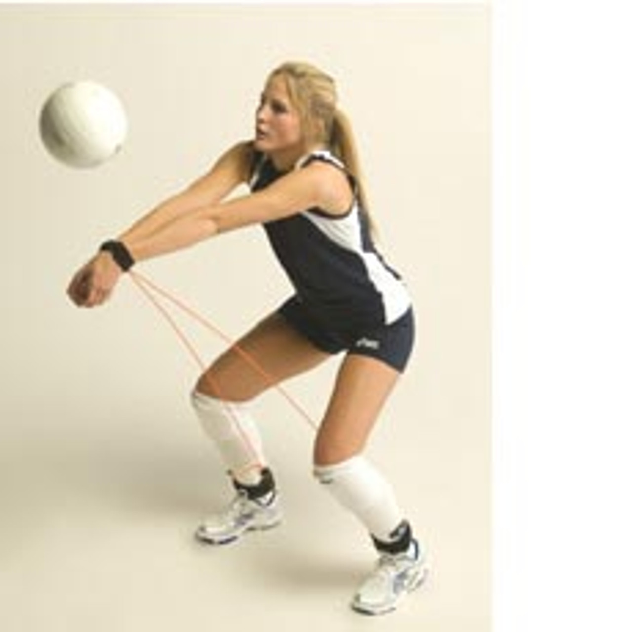 The Pass Rite is an easy to use training tool that utilizes a durable elastic band that attaches to the passer's wrists and ankles preventing excessive upward arm movement. The small, lightweight Velcro wrist cuffs were designed to minimize ball contact interference. The elastic band is adjustable to accommodate any passer's height.
