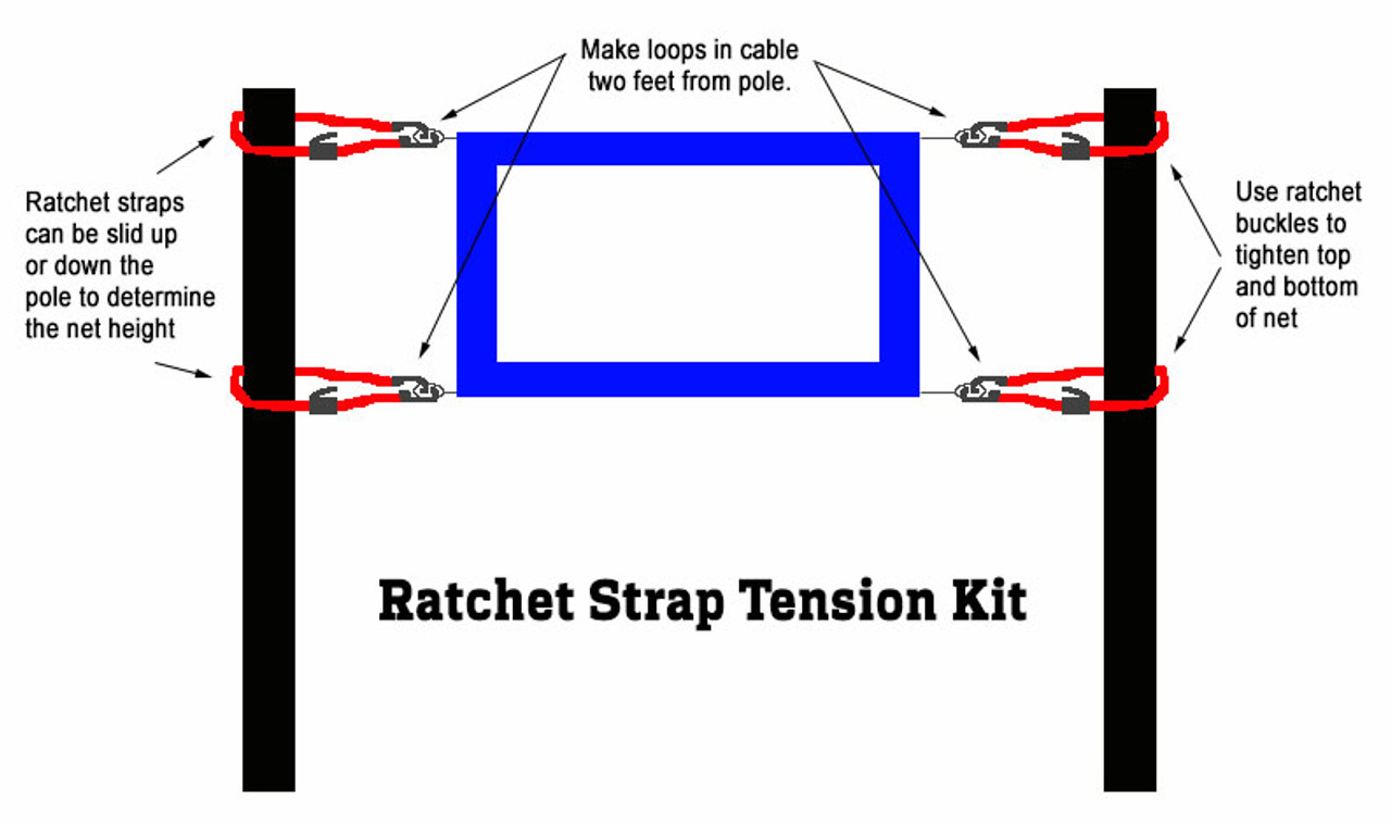 - 4 zinc plated ratchet buckles with 10' long x 1" wide nylon webbing straps to allow for both short and long distances from the net around the support post.