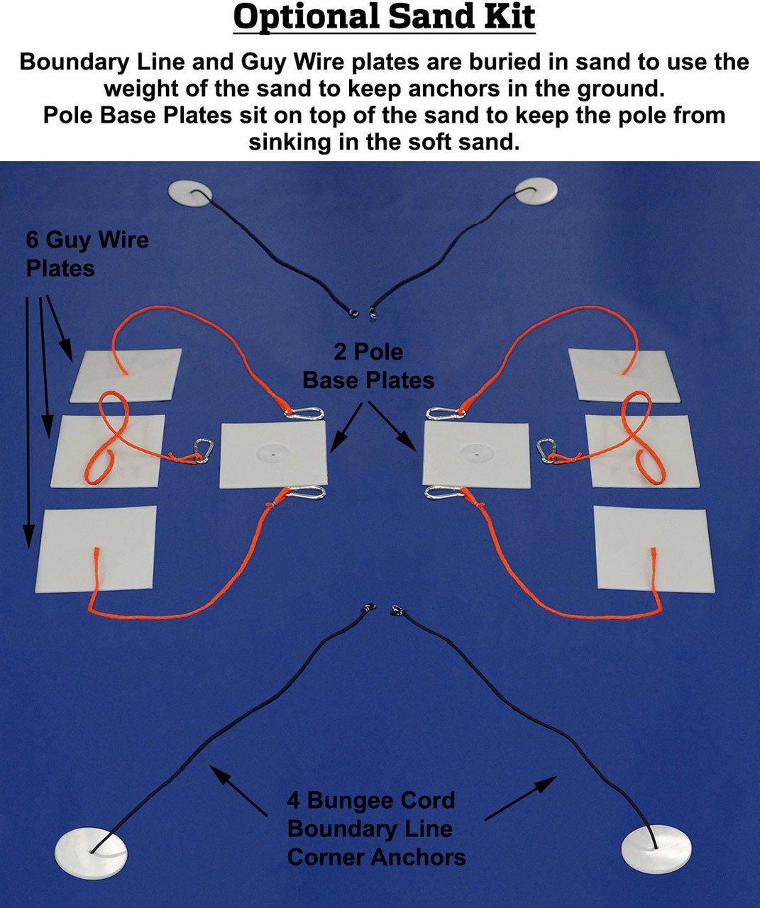 - 2-Piece Heavy Duty Poles– Strong poles with 2.25-inch OD that can adjust to heights for men’s, women’s and co-ed. Each pole has eyebolts on each side, allowing attachment of net and guywires. One pole holds a weather resistant cambuckle built with a nylon web tension strap for quick tension of bottom net cable.