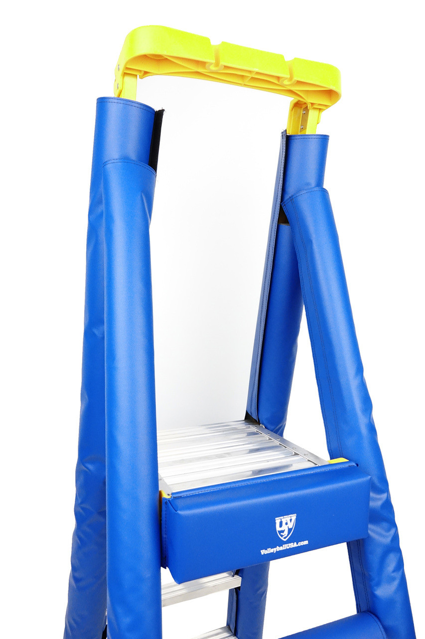 Podium style ladder referee stand with large standing surface area for comfort. This features colored vinyl padding that can be attached and removed, allowing for the easiest storage and setup at your court.