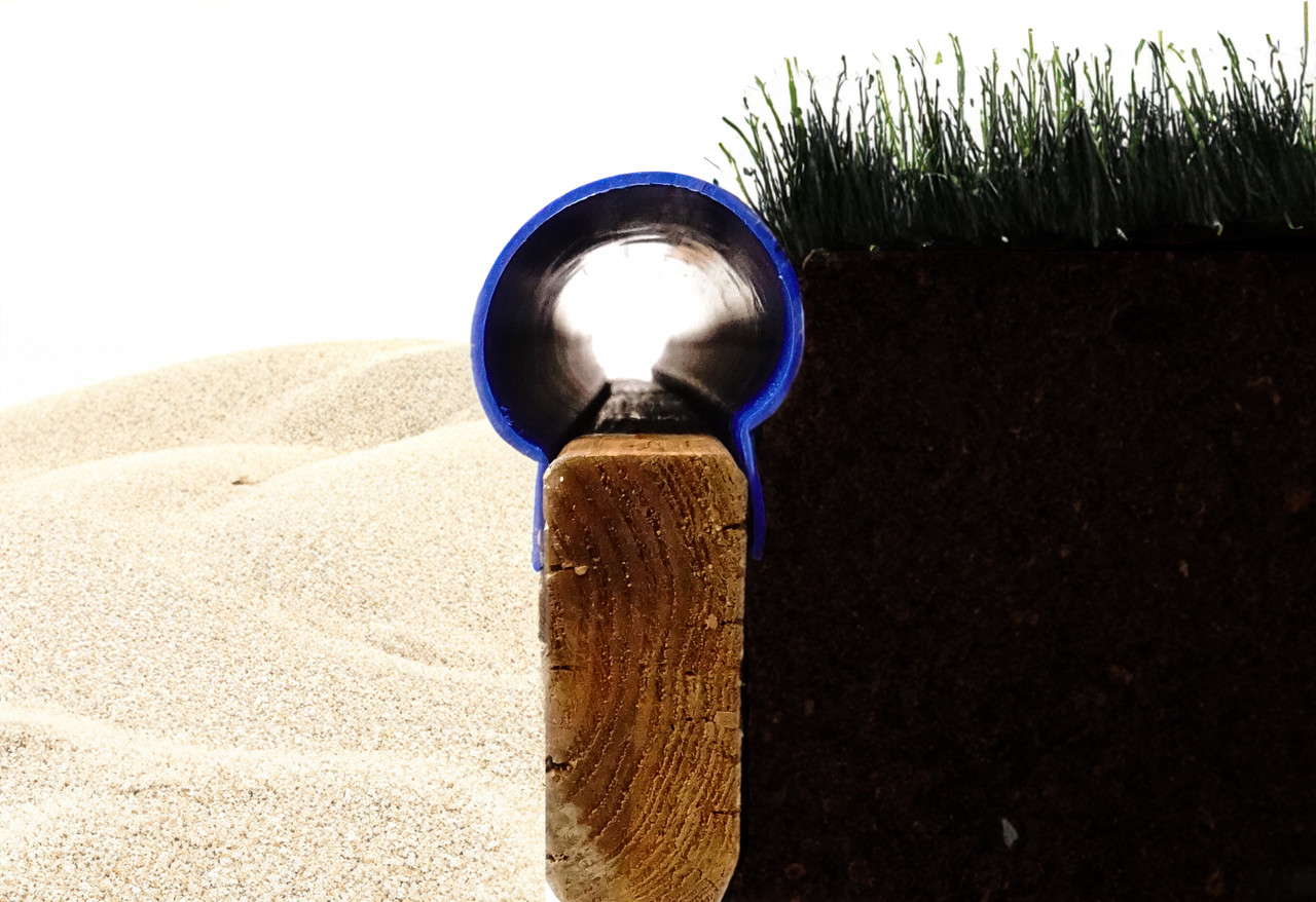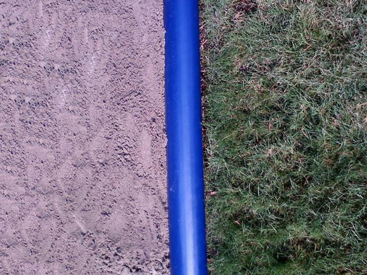 - Screws to the top of 2 by 12 treated lumber with 1" stainless steel pan head screws mounted every foot on both sides of the wood. The wood is buried an inch below grade for the Edge Guard to stand proud of the sand and surrounding area with a 2-3 inch cushion gap for easy installation. (Screws are sold separately are are not included with an Edge Guard purchase).